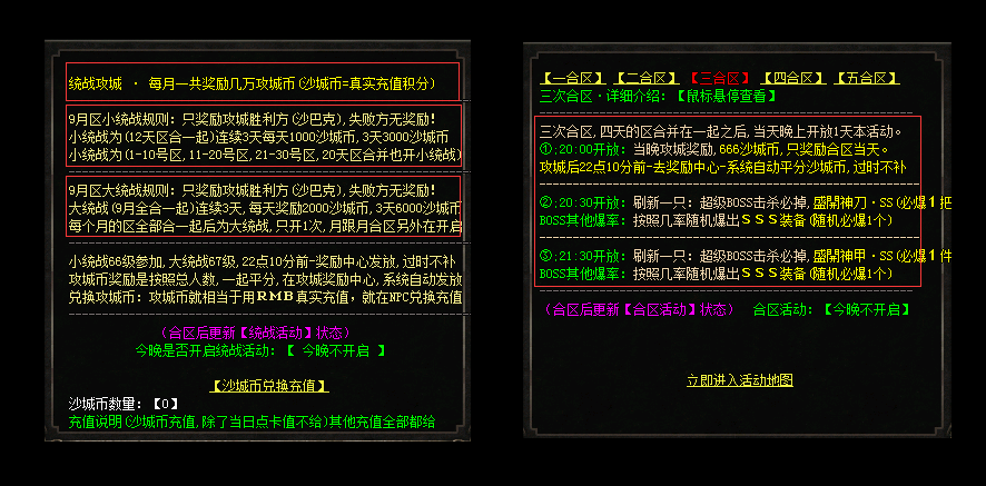 【装备爆率】:本服务器主要以寻BOSS打宝乐趣,请注意各项活动与每个地图的BOSS刷新,合区后开放BOSS之家! |